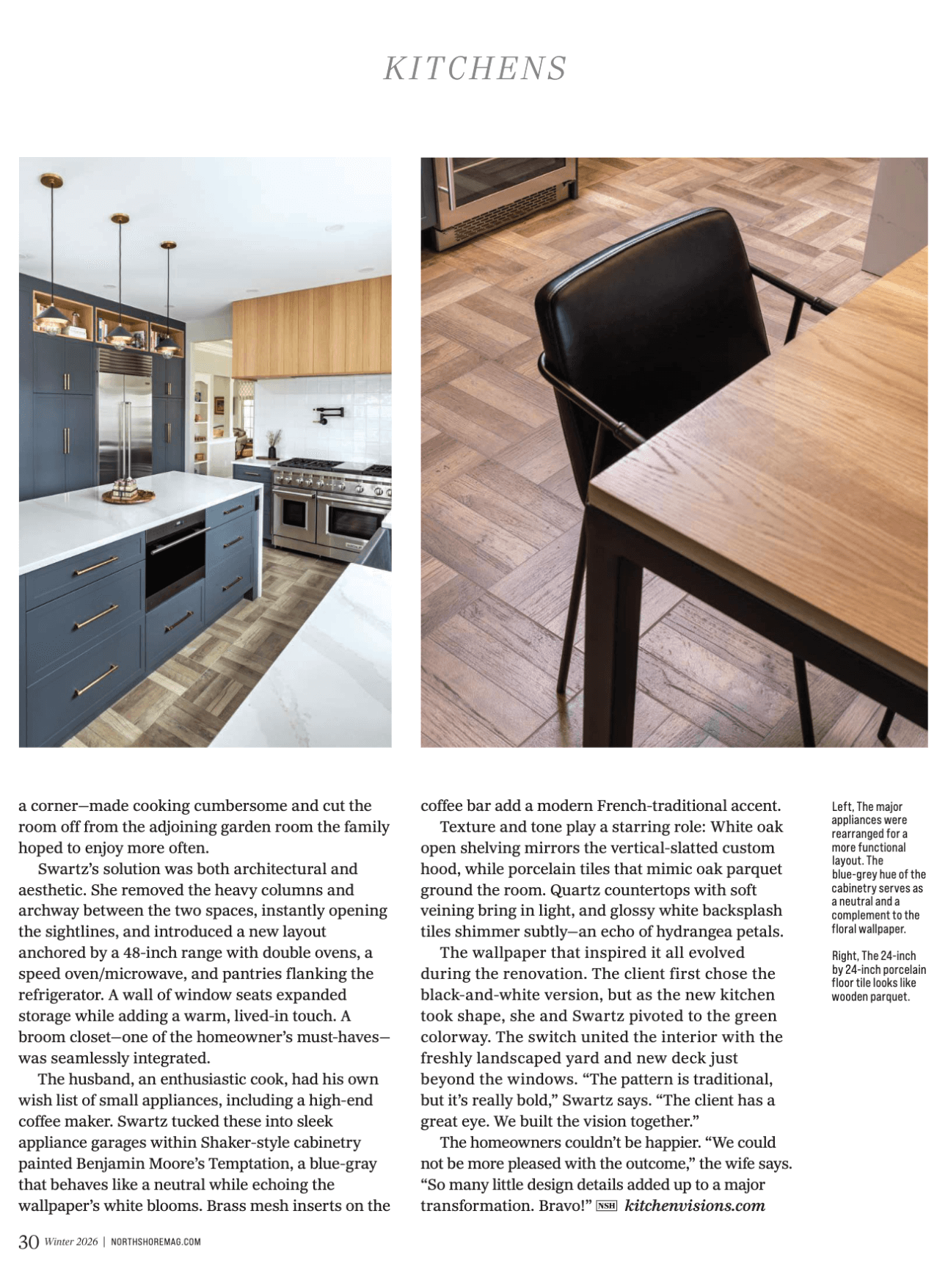 Check out the Winter issue of Northshore Home featuring a Lexington kitchen renovation by KitchenVisions. Architectural changes played a big role in the transformation. By opening sightlines, removing heavy columns, and reworking the layout around a generous 48-inch range, the space now flows effortlessly into the adjoining garden room. The striking hydrangea wallpaper contrasts with the warm wood elements and cool gray cabinetry.